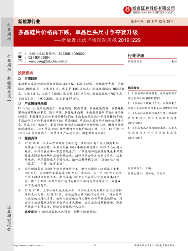 【浙商证券】【20191229】20191229-浙商证券-新能源光伏市场跟踪周报:多晶硅片价格再下跌,单晶巨头尺寸争夺赛升级-8页