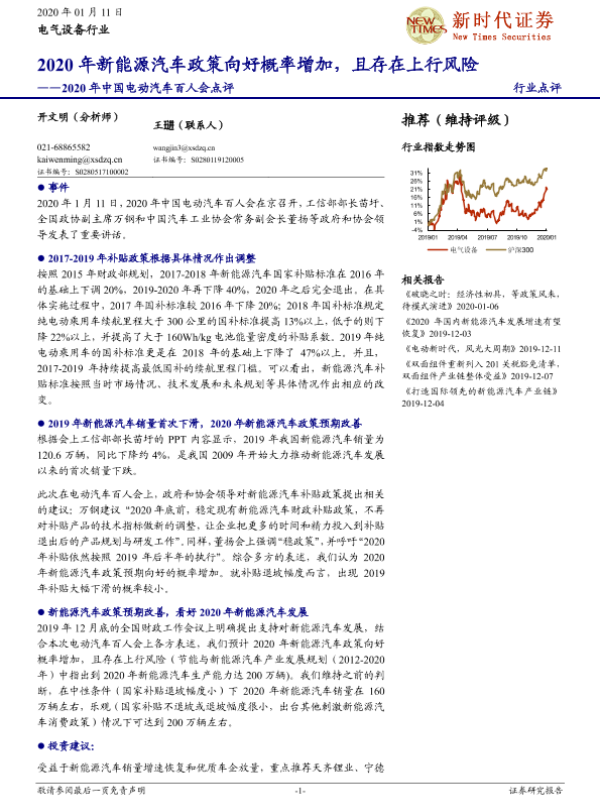 【新时代证券】【20200111】2020年中国电动汽车百人会点评:2020年新能源汽车政策向好概率增加,且存在上行风险-4页
