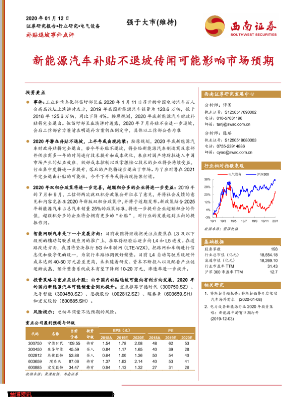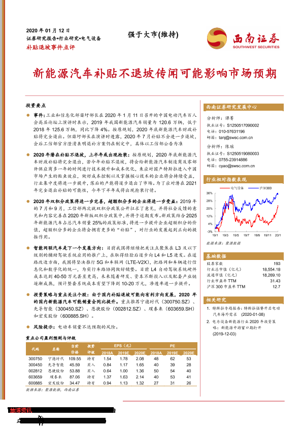 【西南证券】【20200112】电气设备补贴退坡事件点评:新能源汽车补贴不退坡传闻可能影响市场预期-6页