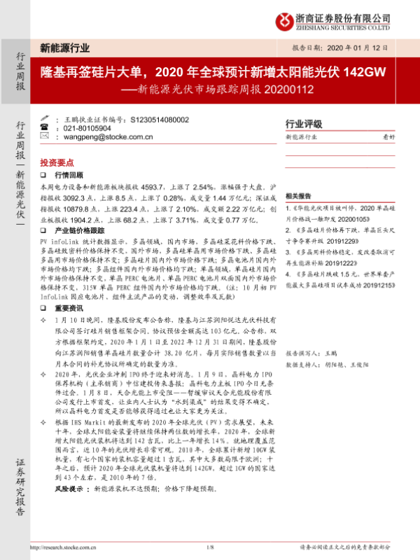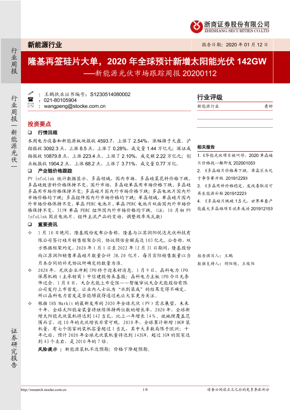 【浙商证券】【20200112】20200112-浙商证券-新能源光伏市场跟踪周报:隆基再签硅片大单,2020年全球预计新增太阳能光伏142GW-8页