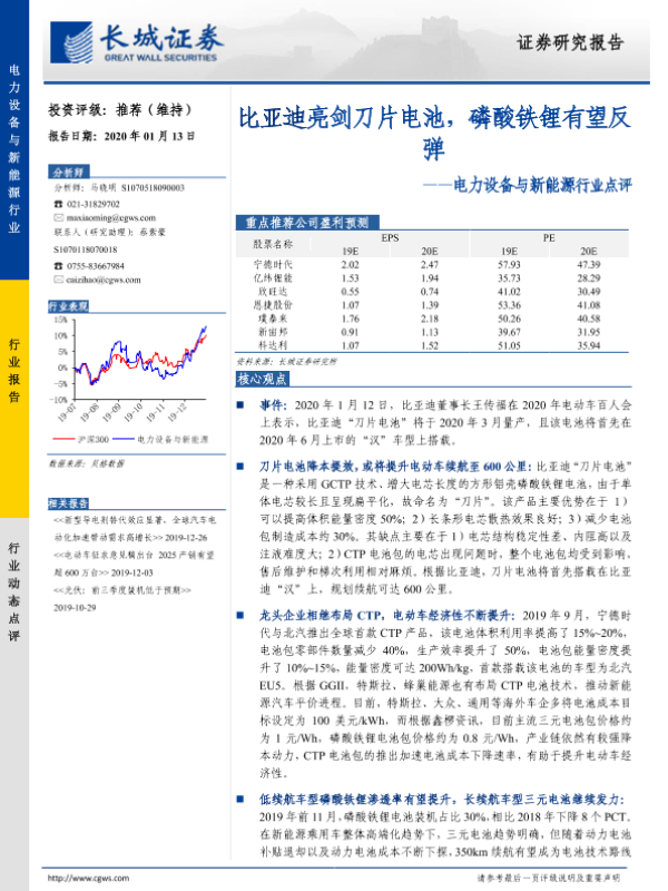 【长城证券】【20200113】电力设备与新能源行业点评:比亚迪亮剑刀片电池,磷酸铁锂有望反弹-3页