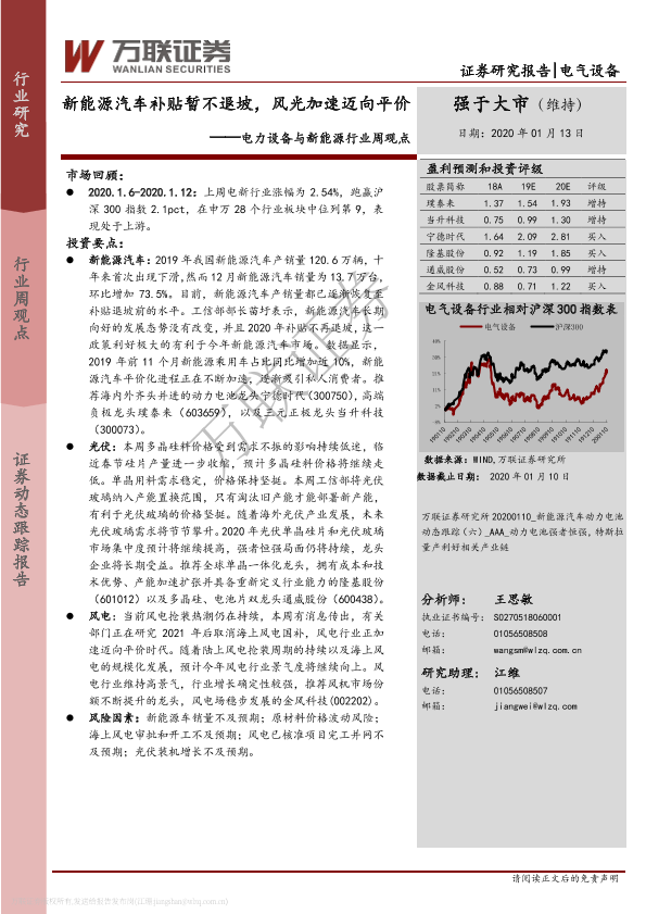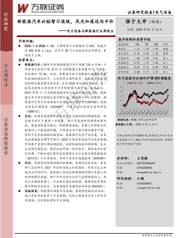 【万联证券】【20200113】电力设备与新能源行业周观点:新能源汽车补贴暂不退坡,风光加速迈向平价-13页