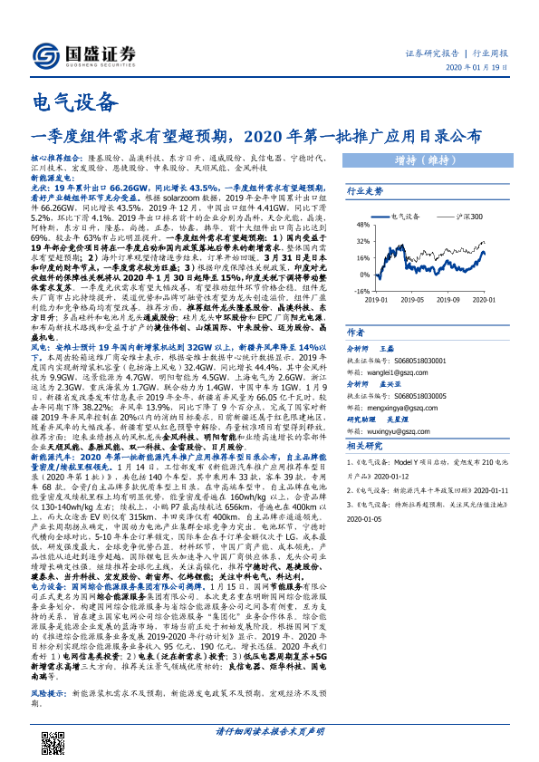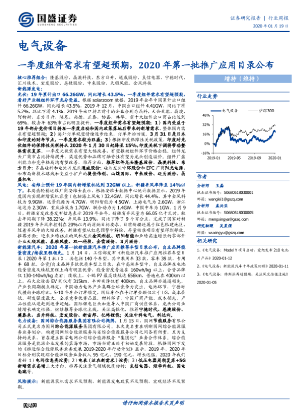 【国盛证券】【20200119】电气设备行业周报:一季度组件需求有望超预期,2020年第一批推广应用目录公布-17页