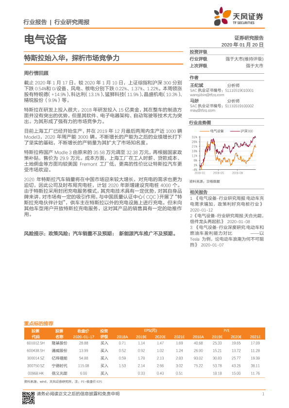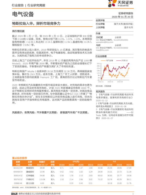 【天风证券】【20200120】20200120-天风证券-电气设备行业研究周报:特斯拉始入华,探析市场竞争力-21页