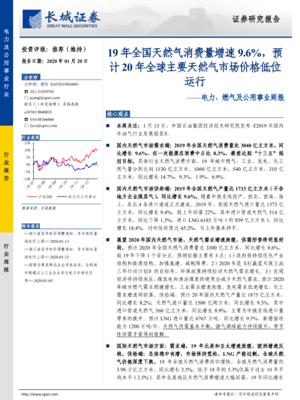 【长城证券】【20200120】电力、燃气及公用事业周报:19年全国天然气消费量增速9.6%,预计20年全球主要天然气市场价格低位运行-17页