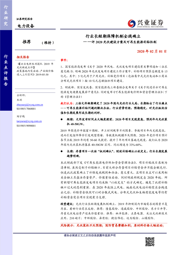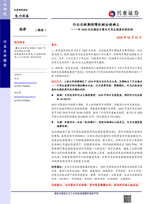【兴业证券】【20200201】评2020光伏建设方案及可再生能源补贴机制:行业长短期保障机制全线确立-8页