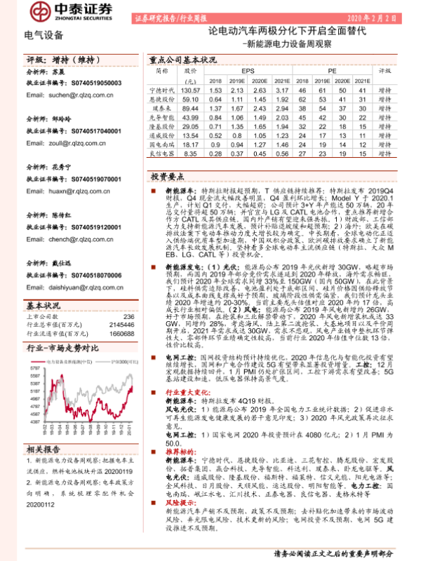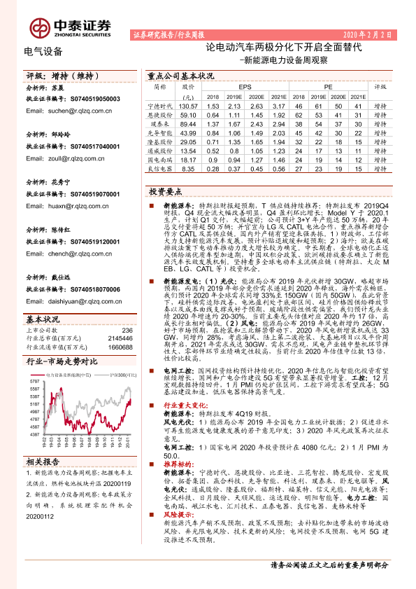 【中泰证券】【20200202】电气设备行业周报:新能源电力设备周观察-论电动汽车两极分化下开启全面替代-22页