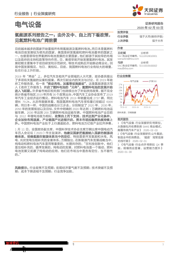 【天风证券】【20200203】电气设备-行业深度研究 氢能源系列报告之一:由外及中、自上而下看政策,见氢燃料电池广阔前景-23页