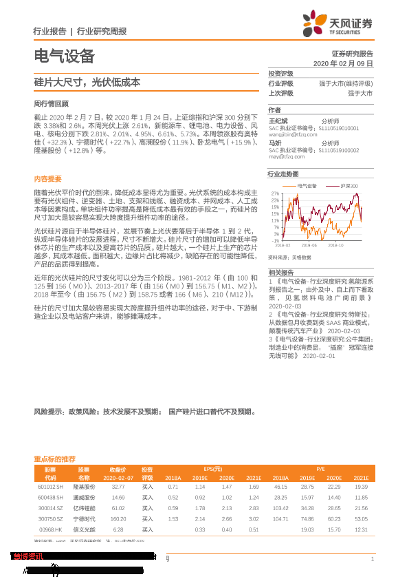 【天风证券】【20200209】电气设备行业研究周报:硅片大尺寸,光伏低成本-18页