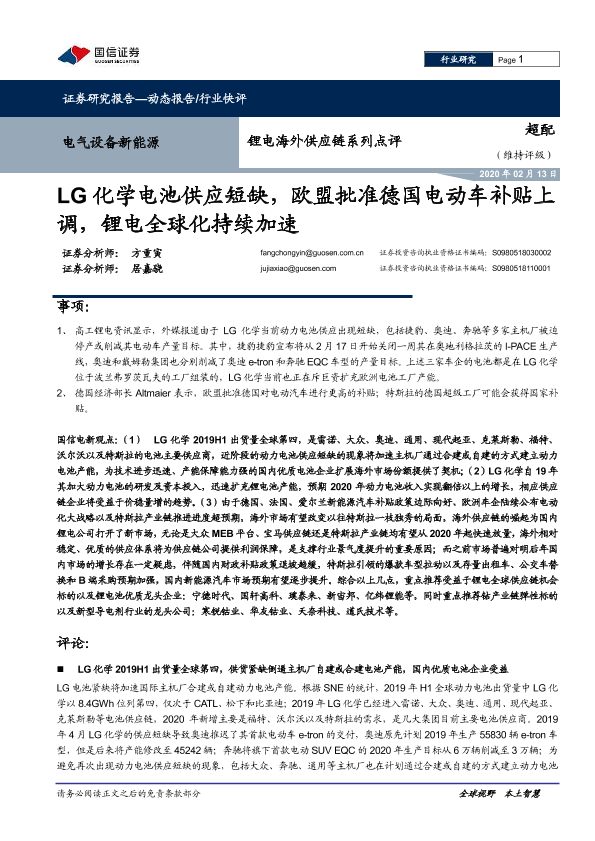 【国信证券】【20200213】20200213-国信证券-锂电海外供应链系列点评:LG化学电池供应短缺,欧盟批准德国电动车补贴上调,锂电全球化持续加速-6页