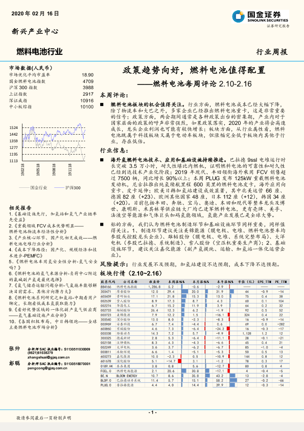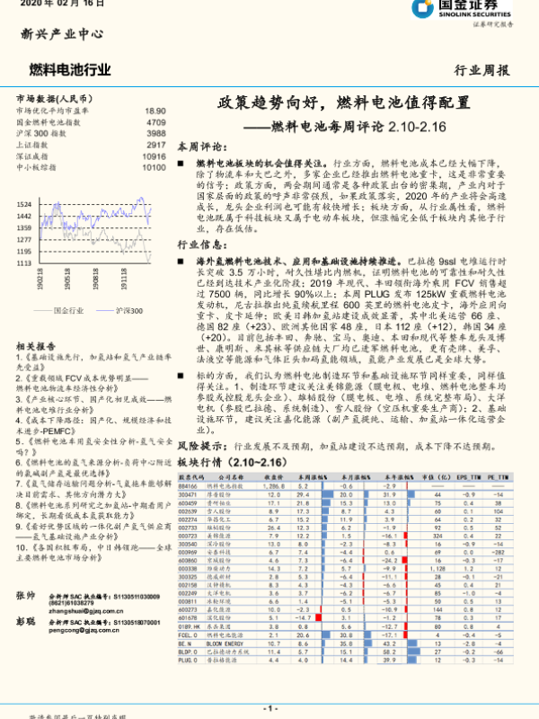 【国金证券】【20200216】燃料电池每周评论:政策趋势向好,燃料电池值得配置-5页