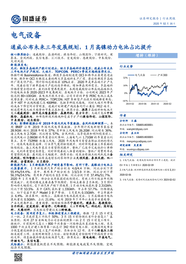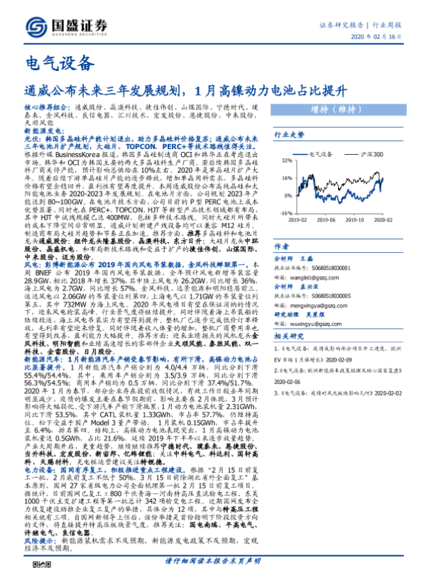 【国盛证券】【20200216】电气设备行业周报:通威公布未来三年发展规划,1月高镍动力电池占比提升-17页