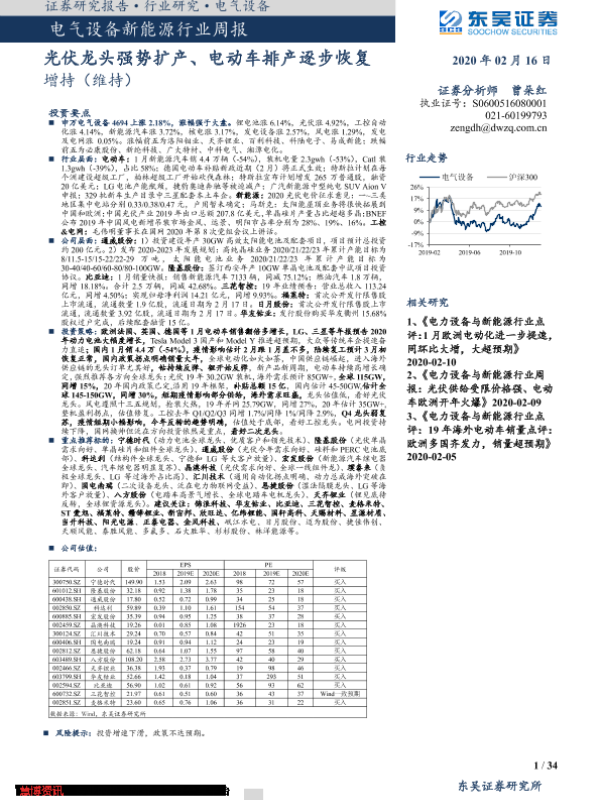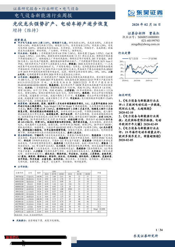 【东吴证券】【20200216】电气设备新能源行业周报:光伏龙头强势扩产、电动车排产逐步恢复-34页
