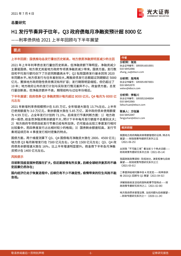 【光大证券】【20210704】利率债供给2021上半年回顾与下半年展望:H1发行节奏异于往年,Q3政府债每月净融资预计超8000亿-31页