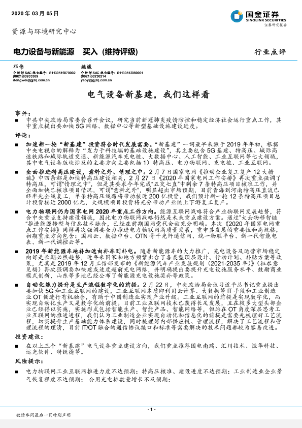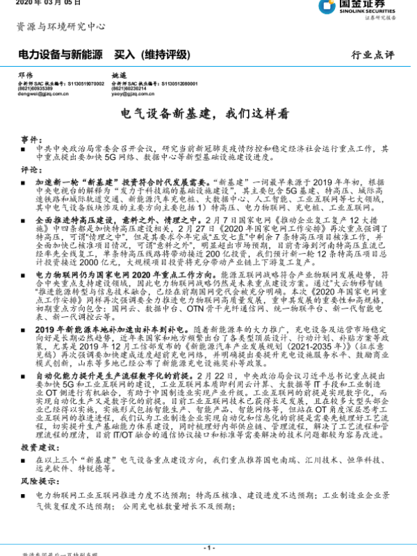 【国金证券】【20200305】电力设备与新能源行业点评:电气设备新基建,我们这样看-6页