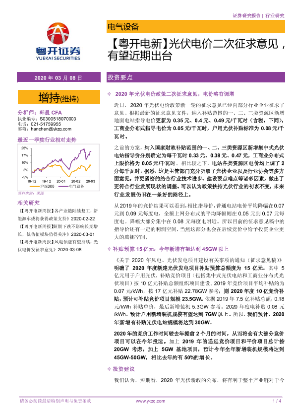 【粤开证券】【20200308】光伏电价二次征求意见,有望近期出台-4页