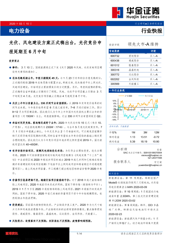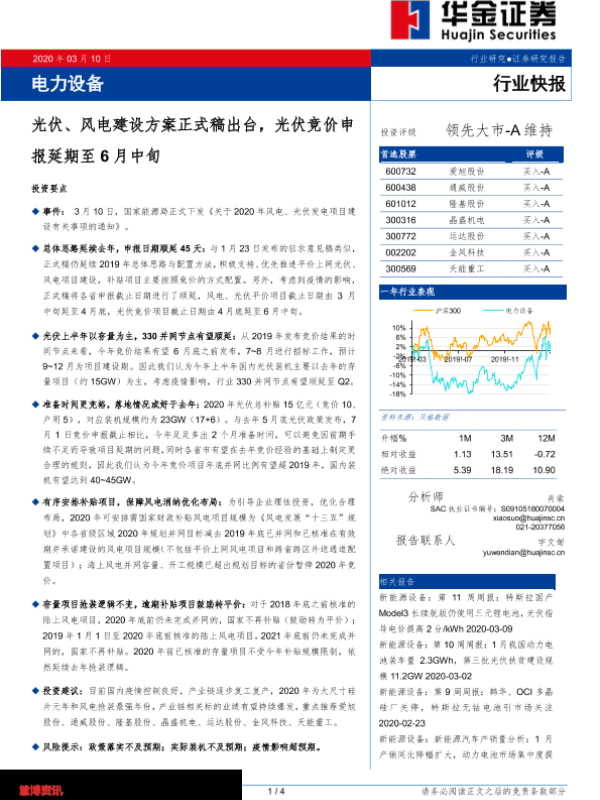 【华金证券】【20200310】电力设备:光伏、风电建设方案正式稿出台,光伏竞价申报延期至6月中旬-4页