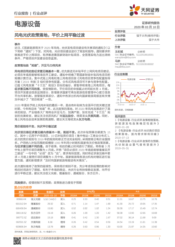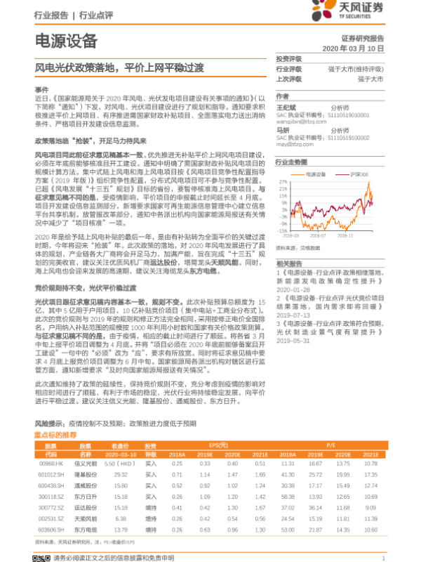 【天风证券】【20200310】电源设备行业点评:风电光伏政策落地,平价上网平稳过渡-2页