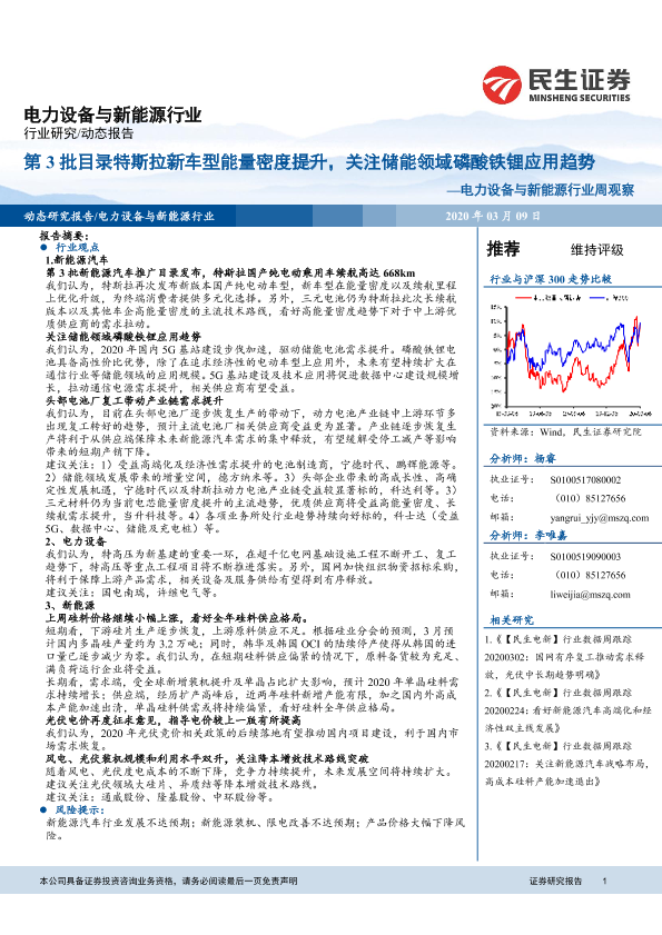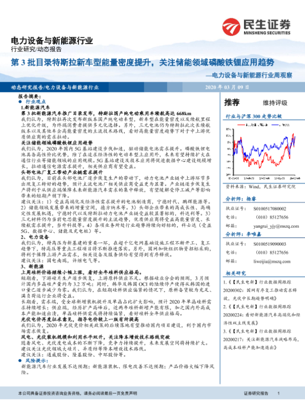 【民生证券】【20200309】电力设备与新能源行业周观察:第3批目录特斯拉新车型能量密度提升,关注储能领域磷酸铁锂应用趋势-16页