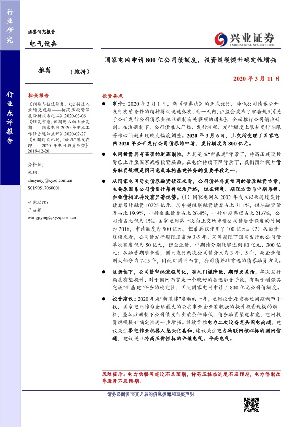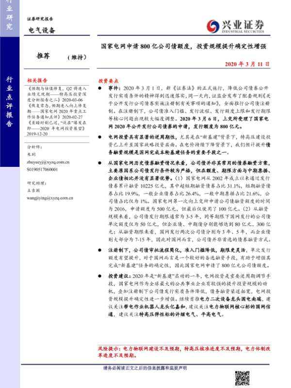 【兴业证券】【20200311】20200311-兴业证券-电气设备行业点评报告:国家电网申请800亿公司债额度,投资规模提升确定性增强-6页