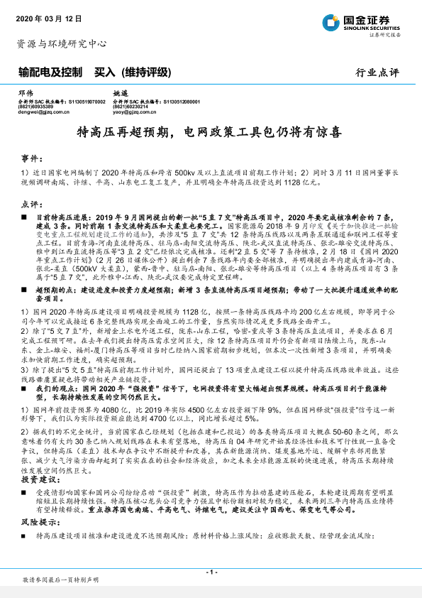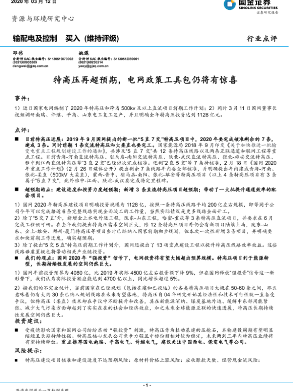 【国金证券】【20200312】输配电及控制:特高压再超预期,电网政策工具包仍将有惊喜-6页
