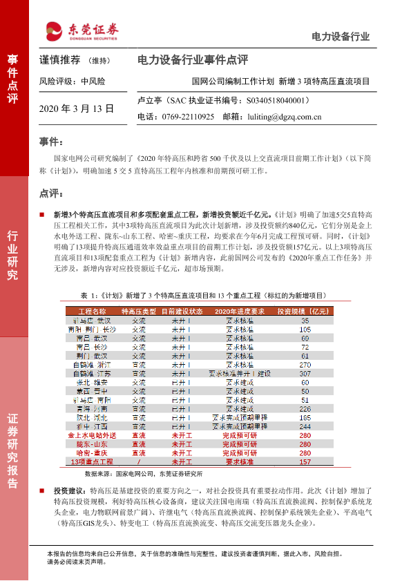【东莞证券】【20200313】电力设备行业事件点评:国网公司编制工作计划,新增3项特高压直流项目-3页