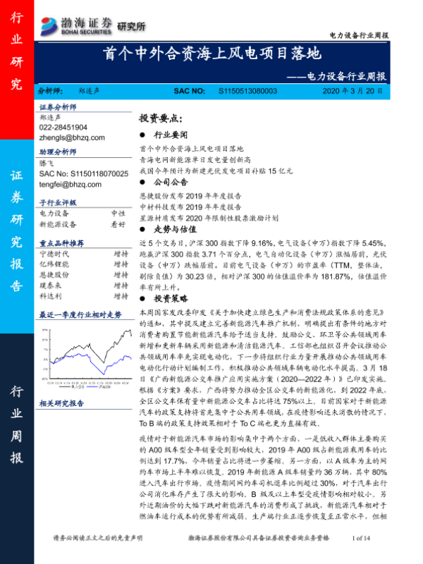 【渤海证券】【20200320】电力设备行业周报:首个中外合资海上风电项目落地-14页