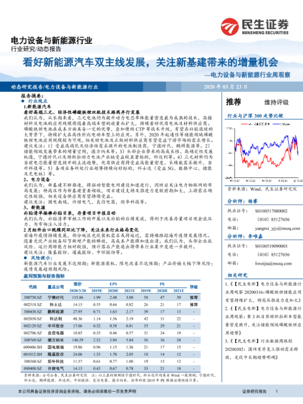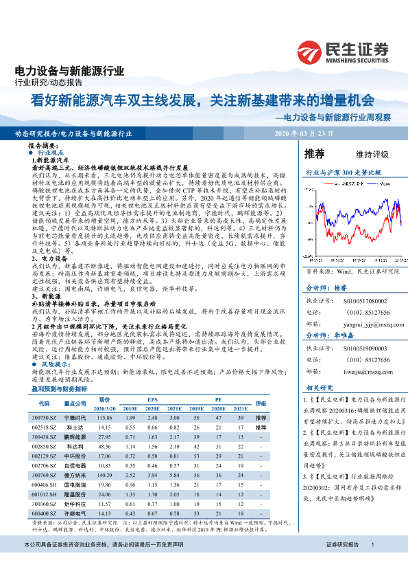 【民生证券】【20200323】电力设备与新能源行业周观察:看好新能源汽车双主线发展,关注新基建带来的增量机会-15页