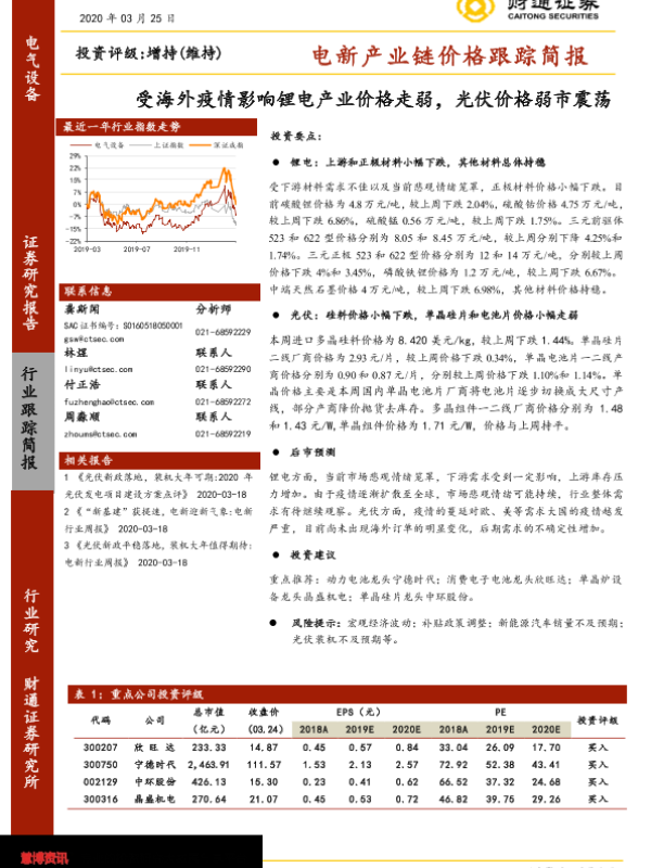 【财通证券】【20200325】电新产业链价格跟踪简报:受海外疫情影响锂电产业价格走弱,光伏价格弱市震荡-10页