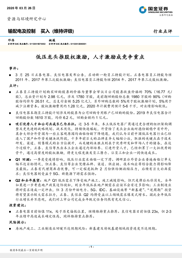 【国金证券】【20200326】输配电及控制行业点评:低压龙头推股权激励,人才激励成竞争重点-3页