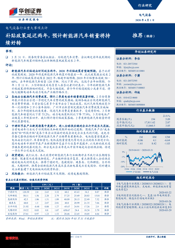【华创证券】【20200401】电气设备行业重大事项点评:补贴政策延迟两年,预计新能源汽车销量将持续好转-3页