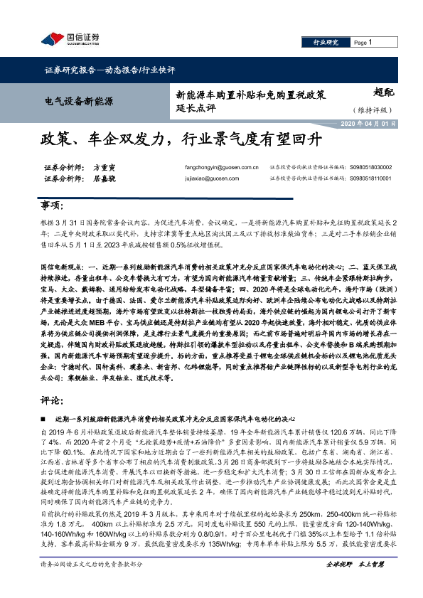 【国信证券】【20200401】新能源车购置补贴和免购置税政策延长点评:政策、车企双发力,行业景气度有望回升-6页