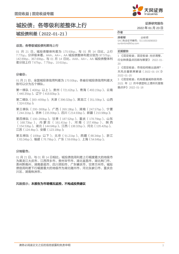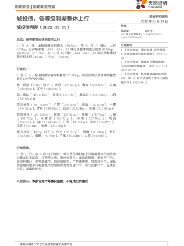 【天风证券】【20220123】城投债利差:城投债,各等级利差整体上行-15页