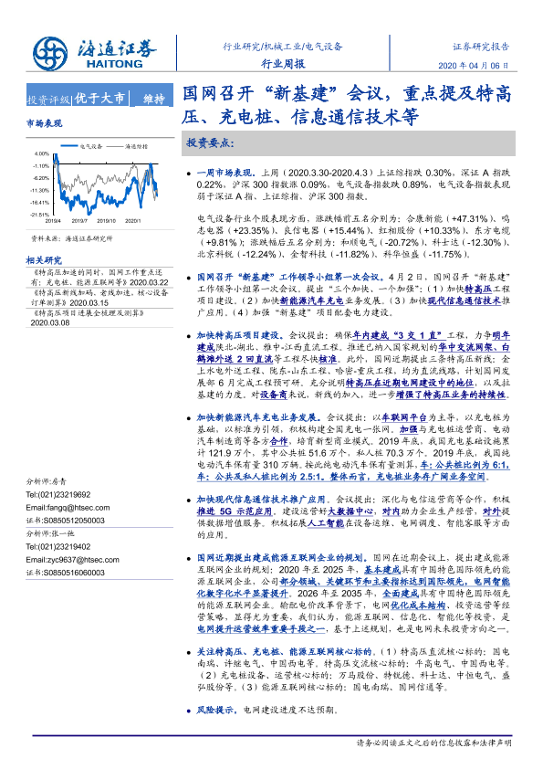 【海通证券】【20200406】电气设备行业周报:国网召开“新基建”会议,重点提及特高压、充电桩、信息通信技术等-3页