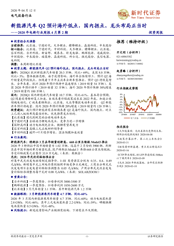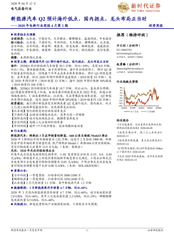 【新时代证券】【20200412】2020年电新行业周报4月第2期:新能源汽车Q2预计海外低点,国内拐点,龙头布局正当时-13页