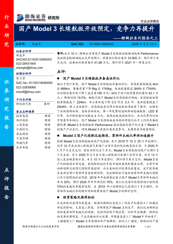 【渤海证券】【20200413】国产Model 3长续航版开放预定,竞争力再提升-6页