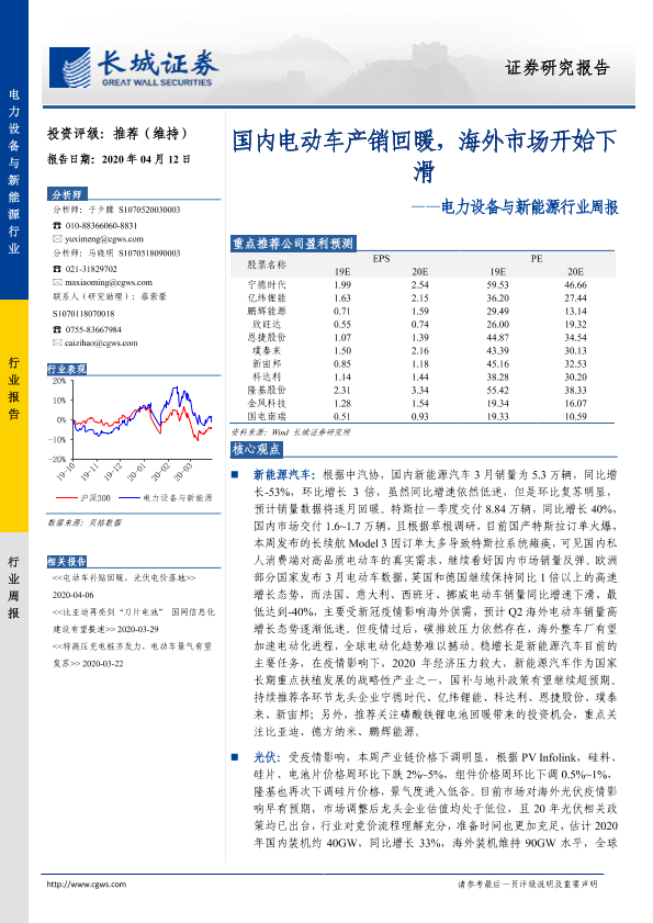 【长城证券】【20200412】电力设备与新能源行业周报:国内电动车产销回暖,海外市场开始下滑-15页