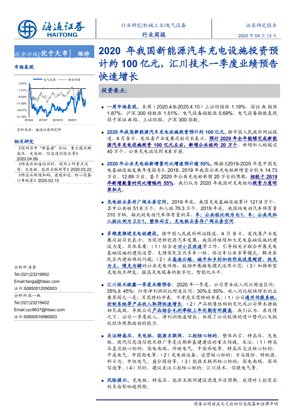 【海通证券】【20200413】2020年我国新能源汽车充电设施投资预计约100亿元,汇川技术一季度业绩预告快速增长-3页