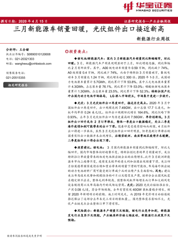 【华宝证券】【20200415】20200415-华宝证券-新能源行业周报:三月新能源车销量回暖,光伏组件出口接近新高-21页