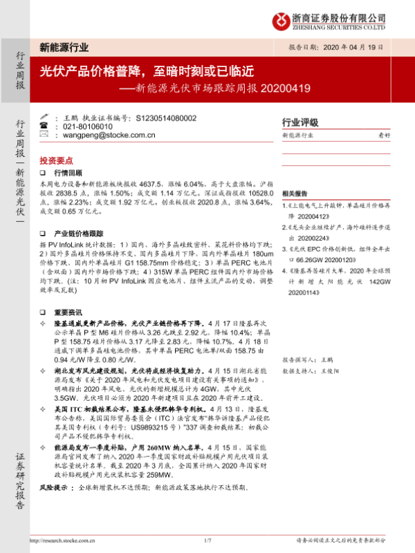 【浙商证券】【20200419】20200419-浙商证券-新能源光伏市场跟踪周报:光伏产品价格普降,至暗时刻或已临近-7页