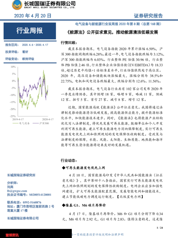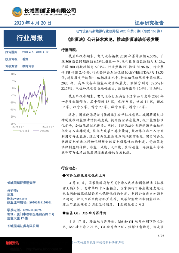 【长城国瑞证券】【20200420】20200420-长城国瑞证券-电气设备与新能源行业双周报2020年第8期(总第168期):《能源法》公开征求意见,推动能源清洁低碳发展-24页