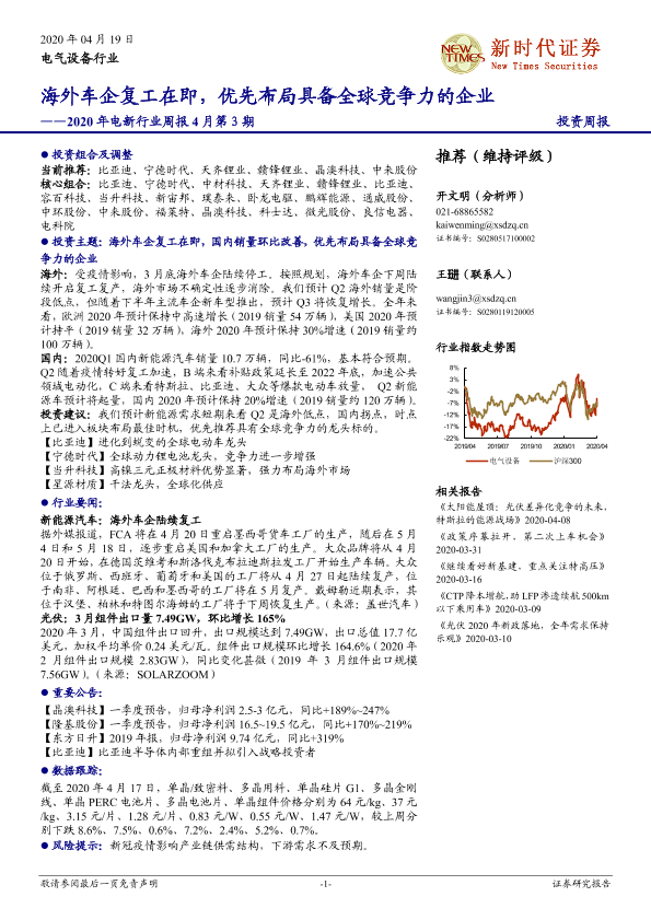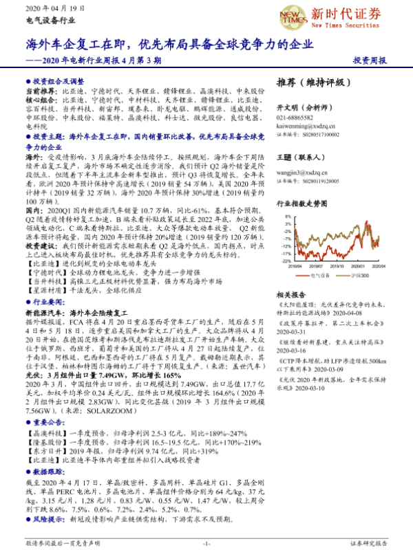 【新时代证券】【20200419】2020年电新行业周报4月第3期:海外车企复工在即,优先布局具备全球竞争力的企业-14页