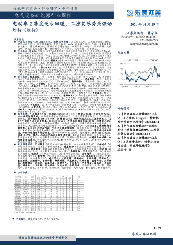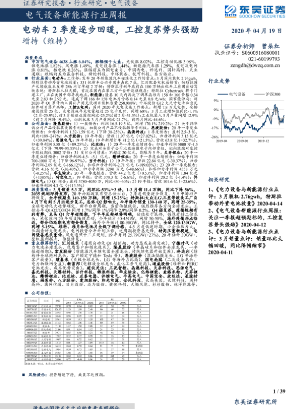 【东吴证券】【20200419】电气设备新能源行业周报:电动车2季度逐步回暖,工控复苏势头强劲-39页