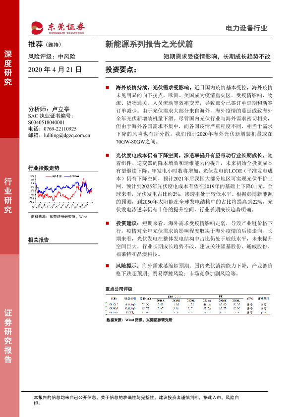 【东莞证券】【20200421】20200421-东莞证券-新能源系列报告之光伏篇:短期需求受疫情影响, 长期成长趋势不改-20页