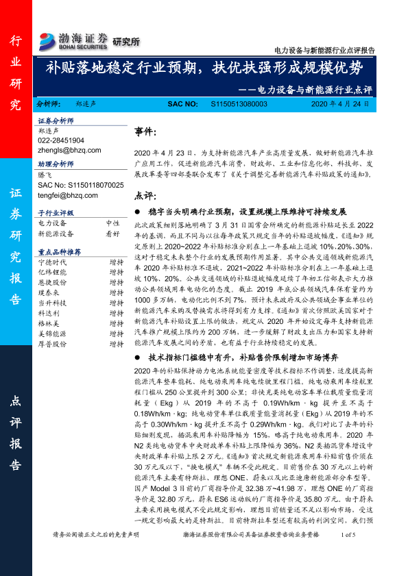 【渤海证券】【20200424】电力设备与新能源行业点评:补贴落地稳定行业预期,扶优扶强形成规模优势-5页