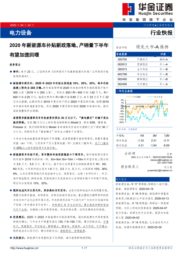 【华金证券】【20200424】2020年新能源车补贴新政落地,产销量下半年有望加速回暖-7页