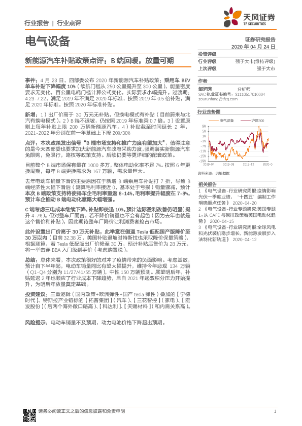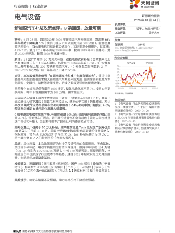 【天风证券】【20200424】电气设备:新能源汽车补贴政策点评:B端回暖,放量可期-5页