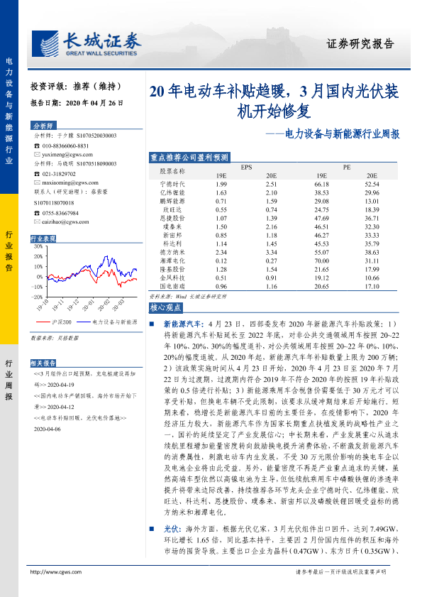 【长城证券】【20200426】20200426-长城证券-电力设备与新能源行业周报:20年电动车补贴趋暖,3月国内光伏装机开始修复-16页