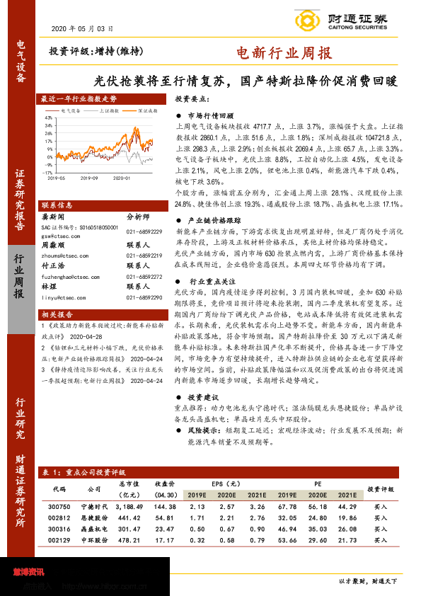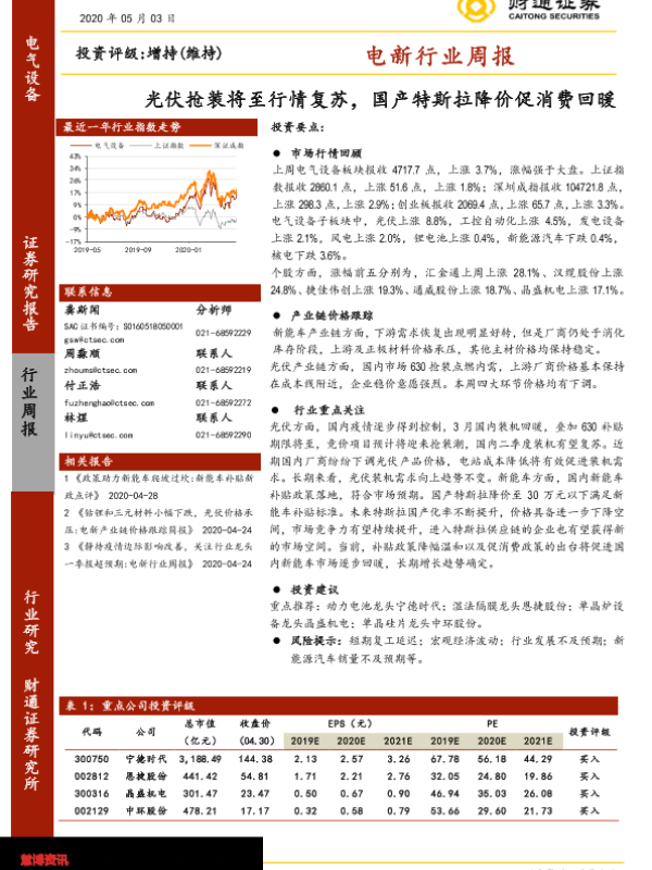 【财通证券】【20200503】电新行业周报:光伏抢装将至行情复苏,国产特斯拉降价促消费回暖-17页