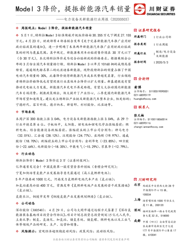 【川财证券】【20200503】电力设备及新能源行业周报:Model3降价,提振新能源汽车销量-16页